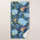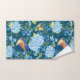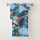 A Royal Blue Bath Towel Set Designed With Blue Jays and A Floral Design.