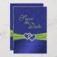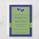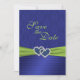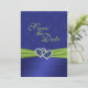 This royal blue and lime green double hearts with PRINTED on ribbon and jewels Save the Date card matches the invitation and other items shown below. The text is all customizable and so are the paper choices. If you require any other items in this same design, such as photo cards, reception cards, wedding bulletin, table cards etc., please email me your request. Existing matching items are shown below.