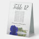 These tent table number signs are not only beautiful, they even include a list of names for the guests at each table, making it easy for your guests to find their seat at your wedding reception. The design is both elegant and romantic featuring a single royal blue or cobalt colored rose lying on its side reflecting in water with waves and ripples. The title is in lacy script calligraphy with bold numbers so your guests can easily find the right table. There is room for the names of the couple and the wedding date.