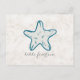 Perfect for a nautical themed wedding is this Rustic Starfish Wedding Table Number Postcard with a dark blue outlined starfish on a light beige marble look background. This classic and simple beach wedding table card is easy to customize with your wedding details. Find more personalization options by clicking Customize.