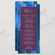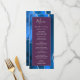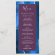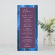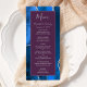 This elegant, modern wedding menu features a watercolor royal blue agate background trimmed with silver faux glitter. The text appears in elegant silver gray handwriting and copperplate fonts on a plum rectangle. The agate design is repeated on the reverse.