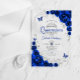Royal blue and silver Quinceanera celebration acrylic invitation. Features, script font, silver butterflies, watercolor roses and tiara. Perfect for an elegant princess style glam celebration. Personalize with your own details. Stylish transparent or frosted acrylic invitations.