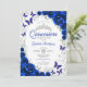 Royal blue silver and white Quinceanera celebration invitation. Features, script font, silver butterflies, watercolor roses and tiara. Perfect for an elegant princess style glam celebration. Personalize with your own details. Printed Zazzle invitations or instant download digital printable template.
