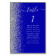 The left-hand edge of this elegant modern wedding table number card features a silver faux glitter border. The word "table" appears in white whimsical handwriting script on a royal blue background. Add the names of your guests who are assigned to each table