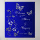 This royal blue, navy blue, and silver grey welcome poster has simulated embossed look silver metallic LOOK butterflies, flowers, and vines on it that matches the wedding invitation shown below. Personalize the text with the names of the bride and groom, along with the wedding date. If you need assistance, please email niteowlstudio@gmail.com.