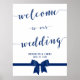 Royal blue and white wedding reception sign print with black bow and customizable text - you can add brides and grooms name and wedding date.
