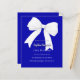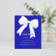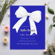 A royal blue colored background, decorated with a large white bow. Personalize and add a name and party details.