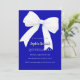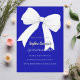 A royal blue colored background, decorated with a large white bow. Personalize and add a name and party details.