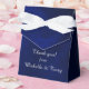 This is a pretty favor box for the Christmas season, especially for a wedding thank you. It features an elegant Christmas deep royal blue pattern background, and a retro image of a silver white Christmas tree on the back. The front holds your customized text in matching silver white. Festive, bright, and elegant for the Holiday season.