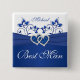 This personalized royal blue and white floral Best Man button with a PRINTED royal blue ribbon and a pair of PRINTED FAUX glitter and diamond jewel joined hearts brooch on it that matches the wedding invitation shown below. The text is customizable and so is the shape and size of the button. ****PLEASE note that if you change the shape that text may get cut off. It will print as it appears on your monitor, and you must allow adequate space around the edges, so do NOT run text right up to the edge. If you need anything changed, please email niteowlstudio@gmail.com.