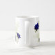 Beautiful coffee mug featuring royal blue and white flowers and green leaves
