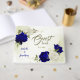 Beautiful wedding guest book featuring royal blue and white flowers and green leaves