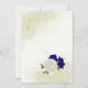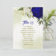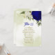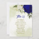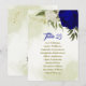 Beautiful wedding seating chart card featuring royal blue and white flowers and green leaves
