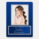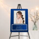 Elegant Quinceañera 15th birthday party foam core easel sign with a royal blue design adorned with white pearls and silver lettering. Personalize by adding a photo and name of the celebrant to the classy pearl frame.