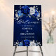 Elegant royal blue white silver theme wedding welcome featuring elegant bouquet of royal blue, Navy, silver, pure white color rose flowers buds and sage green eucalyptus leaves. Please contact me for any help in customization or if you need any other product with this design.