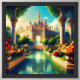 This enchanting painting depicts a majestic castle surrounded by a lush, vibrant garden. A grand fountain cascades down the steps leading to the castle's entrance, reflecting in the still waters of a pond. Oversized golden vases overflow with colorful fruits, adding a touch of opulence to the scene. The overall atmosphere is one of grandeur, beauty, and tranquility.