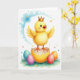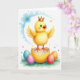 This card shows a fluffy yellow hatchling wearing a tiny golden crown, standing proudly in the cracked halves of a pale yellow eggshell. Its small orange feet press into the shell as its soft wings open wide, like it’s reaching out for a hug from a close friend. Shiny black eyes and a slightly open orange beak give it an eager, friendly look, with a faint blush on its cheeks that adds a gentle, affectionate tone. The background stays bright white, while a curved wash of light blue arches across the top like a soft sky. Tiny pastel speckles float around that blue arc, bringing in a confetti-like touch 🌷. Along the bottom, a strip of green grass supports several egg-shaped decorations in turquoise, lavender, and warm coral, each dotted with lighter spots. Near the top, there’s no wording, and the only lettering appears low on the design in a small, light-toned color beside the grass 🐰.