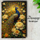 This opulent composition celebrates the majestic beauty of a peacock amidst a lush garden of cream and golden roses. The artwork masterfully combines Eastern decorative traditions with Western botanical detail, creating a richly layered visual feast. The peacock's iconic plumage, rendered in royal blues and gleaming golds, creates a natural mandala effect against the luminous background, while cream and butter-yellow roses unfurl in baroque abundance.