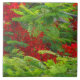 The beautiful vermilion flowers in the original photograph by MaeFlowers on this 6” Ceramic Tile are blooming on a Royal Poinciana. This lovely tree is sometimes called a Flame Tree. Its yellow-green leaves are airy and fern-like. The band of China red flowers crosses diagonally through the leaves, which look a bit like feathers. The photo has a canvas texture, giving it the look of tapestry. but in a modern orange-red, yellow-green color scheme.