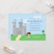 This cute 5x7 boy's birthday party invitation has a Royal Prince Charming theme! There is a grey castle in the background with three blue flags flying at the top. At the bottom, there is a brown haired Prince wearing a gold crown with a blue jacket. On the ground next to the prince, there is a red rose and a shield. On the right side, you can easily customize the birthday party information. Graphics by Zenware Designs at MyGrafico.com