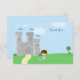 This cute boy's birthday party Thank you flat card has a Royal Prince Charming theme! There is a grey castle in the background with three blue flags flying at the top. At the bottom, there is a brown haired Prince wearing a gold crown with a blue jacket. On the ground next to the prince, there is a red rose and a shield. On the right side, Thank you is written with space below for you to hand write in your message. Graphics by Zenware Designs at MyGrafico.com