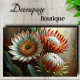Transform ordinary furniture into statement pieces with this stunning protea botanical design. Featuring a magnificent white king protea bloom alongside dramatic red companions, this artwork combines classical botanical detail with modern drama. The rich emerald foliage and golden center stamens create depth against a sophisticated ombre background.