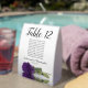 These tent table number signs are not only beautiful, they even include a list of names for the guests at each table, making it easy for your guests to find their seat at your wedding reception. The design is both elegant and romantic featuring a single royal purple colored rose lying on its side reflecting in water with waves and ripples. The title is in lacy script calligraphy with bold numbers so your guests can easily find the right table. There is room for the names of the couple and the wedding date.