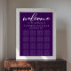 This royal purple wedding seating chart poster features beautiful white typography on a solid deep violet for an evening reception in the winter. Minimalist script and a bold color makes your print pop and stand out from the crowd.