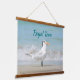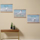 A set of 3 real wood topped hanging tapestries each with a different photographic Royal Tern posing on a sandy beach with beautiful tropical blue sea water background. Each wall art is individually customizable for your own text or Names.