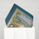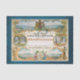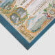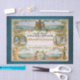 Victorian, royal visit invitation to witness the ceremony of laying the foundation stone of the new railway offices in New Zealand layered on a blue background. Invitation shows four vignettes (of Wellington Harbour, Lyttelton Harbour, Auckland Harbour, and Port Chalmers Harbour), inset black and white portraits of Their Majesties, and figures of a European soldier and a Maori chief. The British crest is at top center. A color art print of natural history styling, perfect for decoupage or crafting supplies.