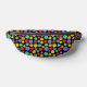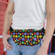 This colorful patterned fanny pack is perfect for fans of role-playing and fantasy board games. It features illustrations of different multi-sided dice in green, purple, orange, red and yellow set against a black background.