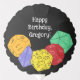 Whether you're throwing a game-themed party or a party for someone who loves fantasy and role-playing games this personalized party balloon is a perfect choice. It features illustrations of rpg style dice with 20-sided, 12-sided and 4-sided dice in bright colors against a black background.