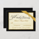 Create your own personalized RSVP cards for 50th Wedding Anniversary Party Invitations -- Beautiful black and gold with ribbon and golden gemstone heart. Classic engraved-look typography with fancy vintage style swash script lettering -- Elegant, affordable luxury, and uniquely customized for you! Just add the names, date, and details for your special milestone anniversary celebration. **NOTE: All elements of this design are part of the PRINTED image -- the ribbon, jeweled brooch, and frame are NOT raised, embossed, or presented as real embellishments. Sized for small invitation cards. Click "Customize It" to change the size, paper options, or font choices. Other sizes and styles available in gallery. © Teri Francis. Coordinating sets with matching postage and thank you cards available upon request.
