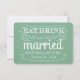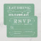 Eat, Drink, and be Married -- Vintage style rustic country wedding invitation RSVP Response Cards -- Swirly, curly scrolls and old-fashion typography on sage mint green burlap background. Add your names and wedding info in this easy to use template. Elegant but fun and whimsical, woodcut style with loose script calligraphy can be modified for your formal or semi-formal retro wedding theme. Casual modern country style is perfect for trendy rustic weddings with a fun touch of sophisticated charm for the traditional bride and groom. Please contact us for help with customization if you need additional room for your wedding details. Other sizes and chalkboard styles available. Note: This is a paper card with a PRINTED image of burlap for decorative effect. There are no real or raised texture.