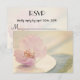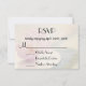 A dreamy magical RSVP card. A single cherry blossom flower showing off its fragile petals and soft pink color. This pretty floral can be seen sitting alone on a white porcelain plate placed on a table. A soft and delicate design.