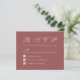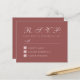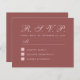 A simple budget RSVP for a marsala wedding color. It has only blush pink text on marsala background. The title RSVP and the letter M are written in an elegant calligraphic script, the rest in caps. The little squares to check are also blush pink (a very light nuance of pink, close to white). Marsala is a brownish red, a modern color.
