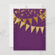 RSVP response return card with envelope. Sleek. Modern. Chic. Understated glam - with glittering pennant banners in two shades of golden glitter with sparkling twinkling falling confetti in various sizes and shade of gold. Sparkly starburst shining stars highlight the sparkle. A very contemporary typography text layout that is anything but traditional. It is simple and short. It says to your guests, "We're throwing a party and it will be the party of a lifetime!" For the elegant but non-traditional bride and groom. COLORS: deep dark violet eggplant purple and gold, golden glitters. Especially suited for fall or winter weddings, New Year's Eve Parties, Birthday parties and Anniversary party announcements.