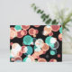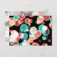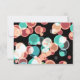A fun and playful wedding rsvp, with a group of multicolored bubbles bouncing around on a black background. These spherical shapes are bright turquoise green, pastel orange, red rust and cool blue. Contrasting on a black background these circular shapes really pop.