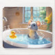 Cute gray mouse in a bathtub with soap bubbles and yellow rubber duck.