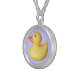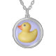 Photograph of cute yellow rubber duck on sky-blue background. Wonderful gift for a little girl.