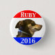 This is the campaign button for Ruby. She is a dog, a very cute dog. This is her Facebook page : https://www.facebook.com/rubythechocolateratterrier She is running for president. Her platform : If everyone just picked up their own poop, the world would be a better place. Her slogan : Vote for Ruby. She's a good girl.