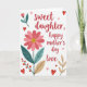 This design shows a large, many-petaled flower blooming from the lower-left, its layered petals shaded in rosy pinks and gathered around a golden center that catches the light. A deep green stem and broad teal leaves support the bloom, while a smaller sprig of ruby-red berries and a few earthy, muted leaves frame the scene like gentle companions. The background stays bright white, giving the colors room to breathe and letting the arrangement feel airy and affectionate ❤️. Scattered across the open space are tiny hearts in red and blush tones, drifting like little signals passed between close loved ones. The main message appears in flowing crimson lettering across the upper half, with the words spaced to avoid the flower and keep the layout balanced. The lettering sits slightly right of center, leaving the left side to feel like a quiet corner where the bouquet leans in. Soft highlights along the petals and a faint glow around the hearts add a tender, friendly sparkle 🌼. The lower-left bloom shows pale pink outer petals, darker rose layers inside, and a warm gold center beside teal leaves and red berries.