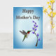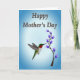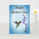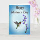 Designed with a small bird in mid-flight, the illustration shows it hovering close to a slim branch of purple, bell-shaped flowers, as if pausing for a gentle kiss of nectar ❤️. The bird has a ruby-red throat, an emerald-green back, and a bright white belly, with its long beak angled toward the nearest bloom to suggest a tender, caring moment. Behind them, the background fades from a light sky blue near the center to a deeper blue around the edges, like early morning air. Near the top, the words “Happy Mother’s Day” sit centered and slightly arched, written in warm brown lettering with a soft shadow for depth. The flowers cluster along the upward-reaching branch, their deep purple petals contrasting against the cool blues and drawing the eye back to the bird’s face. A small 🌼 touch appears in the way the blossoms seem to lean toward the bird, creating a quiet sense of closeness. The final detail is the smooth blue gradient that frames the scene, with the darkest tones gathered at the corners.