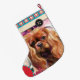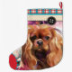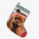 Christmas stocking with Ruby Cavalier king charles spaniel art design. floral. Holiday Art stocking. red and turquoise colors. checker traditional pattern.