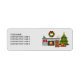 Destei's original cartoon illustration of a cute ruby color Cavalier King Charles Spaniel breed dog. Next to the dog there is a personalizable text area. The dog is placed in a festive living room that has a fireplace. Two red stockings hang on the fireplace mantel. On the top of the fireplace there is a green wreath that is decorated with a red bow and some yellow circles as lights. On top of the mantel there are three small triangle shaped trees also decorated with yellow circles. On the other side of the mantel there are two beige candles. Next to the fireplace there is a festive green Christmas tree with two presents under it. The Christmas tree is decorated with red and yellow ornaments and a gray garland. On the top of the tree there is a yellow star.