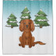 Destei's original cartoon illustration of a cute ruby color Cavalier King Charles Spaniel breed dog. The dog is placed in a winter scene. In the scene it is snowing in the background and there are three green fir trees behind the dog. The trees have some snow on them. The background is a light blue to white gradient giving this design that freezing cold winter day look.