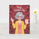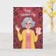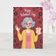 This card shows an older woman with soft, wavy gray hair, red glasses, and a wide, friendly smile that feels instantly welcoming. She wears a pink top under a mustard-yellow cardigan, standing out against a deep red background. The background is filled with dark flower shapes with small yellow centers, giving the scene a cozy, patterned look. Her right hand reaches out as if she’s greeting you, and her left hand holds a pink gift box with polka dots and a golden ribbon. Near the top of the card, the words “Happy Valentine’s Day” appear in white, flowing cursive-style letters. The whole image feels like someone cheerful is offering a little gift and a kind moment, which makes it meaningful for a friend, partner, or family member. It’s a sweet way to say you care and you’re thinking of them 🥰❤️.