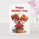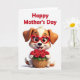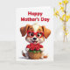 This card shows a cute, human-like puppy sitting front and center with a gentle, affectionate posture that feels like it’s offering a friendly hug ❤️. Its fur mixes warm caramel brown with creamy white patches, shaded to look soft and cozy. Big, expressive eyes peek out from oversized red glasses shaped like hearts, adding a sweet, romantic touch to its look. The puppy smiles wide with a small pink tongue showing, as if it’s happily sharing a gift with someone it adores. In its paws, it holds a woven basket packed with deep red roses and leafy green stems, arranged like a careful bouquet meant for a loved one 🌼. Across the top, the words “Happy Mother’s Day” appear in thick red lettering, centered above the character. The background stays bright white with even lighting and faint shadows under the puppy and basket. The roses have layered petals in rich red tones, with green leaves peeking out around the rim of the basket.