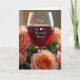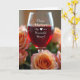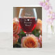 This greeting card centers on a clear stemmed glass filled with deep ruby-red liquid, catching a soft glow that makes the surface gleam. Across the front of the glass, a flowing white handwritten-style message sits slightly angled, with a small red heart nearby for a romantic touch ❤️. Around the glass, roses in apricot and rosy blush lean inward as if gently gathering close, their petals suggesting a tender, affectionate moment. The flowers fade into a soft blur toward the edges, creating a warm background that keeps the focus on the glass and the message. Light and shadow fall smoothly across the scene, highlighting the silky petal textures and the translucent shine of the drink. A few green leaves peek between blooms, adding calm contrast to the warm reds and peaches 🌼. The greeting text stays centered over the glass, while the heart mark rests just below and to one side. In the foreground, a cluster of blush roses curves along the lower edge, with the stemmed glass rising sharply above them.