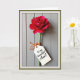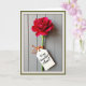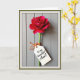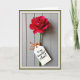 This card features a tall, single red flower with many layered petals, standing upright like a quiet romantic gesture ❤️. The bloom looks like a ruffled carnation, with deep crimson petals that shift into ruby and pink highlights as the light catches the edges. A slim green stem runs down the center, creating a gentle contrast against a soft gray background that resembles vertical painted wood panels. Near the lower part of the stem, a small white tag is tied on with a bright orange twine bow, like a little note left for someone special. The tag includes a short Mother’s Day message in thin, flowing dark lettering, centered neatly on the white space. Soft side lighting adds tender shadows, making the petals feel plush and the tag feel like a keepsake tucked in with care 🌼. The orange bow sits just below the tag, with two short strands of twine curling slightly against the pale gray paneling.